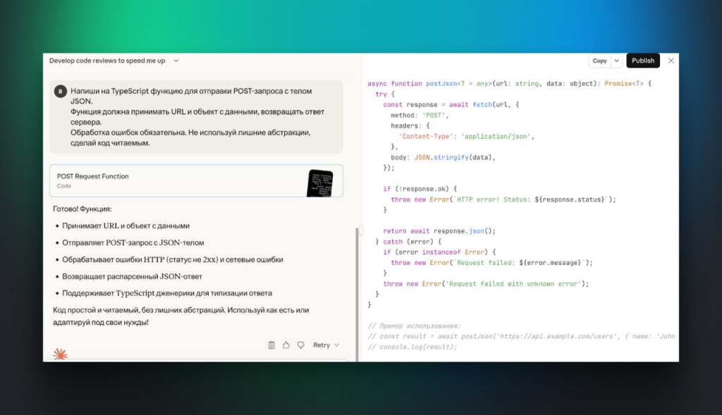 ИИ помогает быстро генерировать скрипты для выгрузки данных, создавать чат-ботов или настраивать простые CRM-функции. Это удобно для собственных проектов, обучения сотрудников, юнит-тестов и учебных примеров кода.