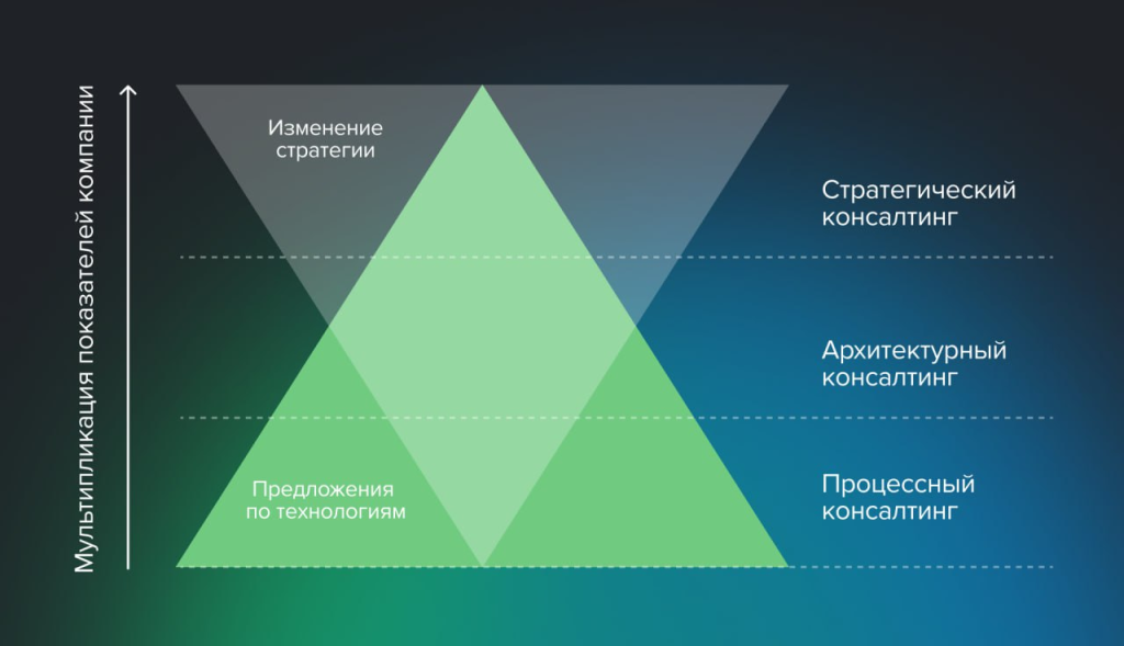 Стратегический консалтинг — формирует IT-стратегию и интегрирует ее с бизнес-целями. Он отвечает на вопрос: «Какие технологии принесут максимальную пользу в долгосрочной перспективе?»